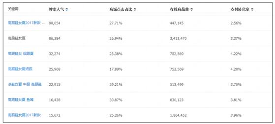 然后你再点击一下“相关搜索词”这个模块,下面有很多的数据指标,这是你选择长尾词非常重要的点。比如搜索人气、点击率、商城点击占比、在线商品数、支付转化率等等。然后你会发现,生意参谋会根据“高跟鞋女夏”这个关键词给你推荐500个长尾词,都是围绕这个核心词的。那么这才是跟你高度相关,并且对店铺标签的强化和产品标签的强化,有积极的促进作用的。